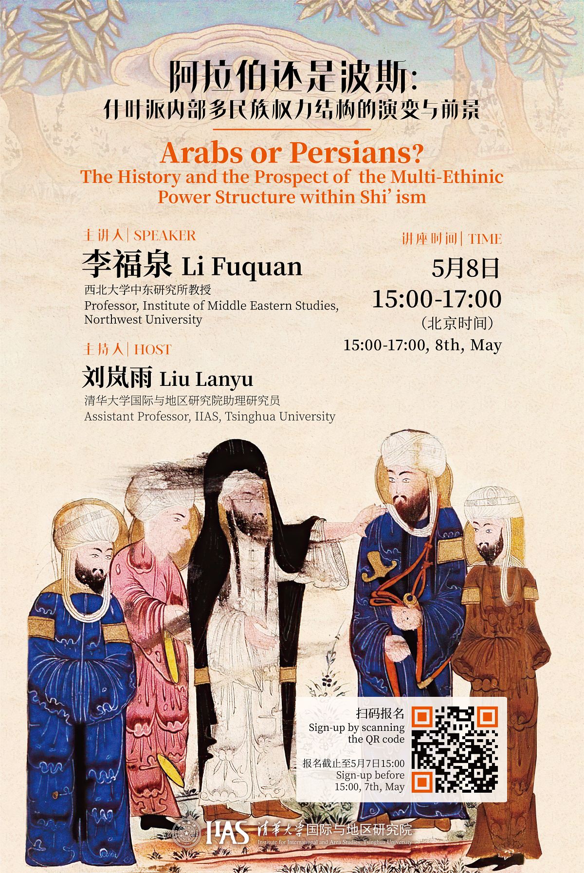 • On May 8, 2022, Professor Li Fuquan from the Institute of Middle Eastern Studies at Northwest University gave an online lecture entitled “Arabs or Persians? The History and the Prospect of the Multi-Ethinic Power Structure within Shi’ism” for scholars from the Institute for International and Area Studies (IIAS) of Tsinghua University and audience from Tsinghua or other institutions. Liu Lanyu, Associate Professor at the IIAS hosted the lecture. Nearly 300 participants from the Cultural Council of the Embassy of the Islamic Republic of Iran in China, Al-Mustafa International University, and institutions and universities at home and abroad attended the lecture.