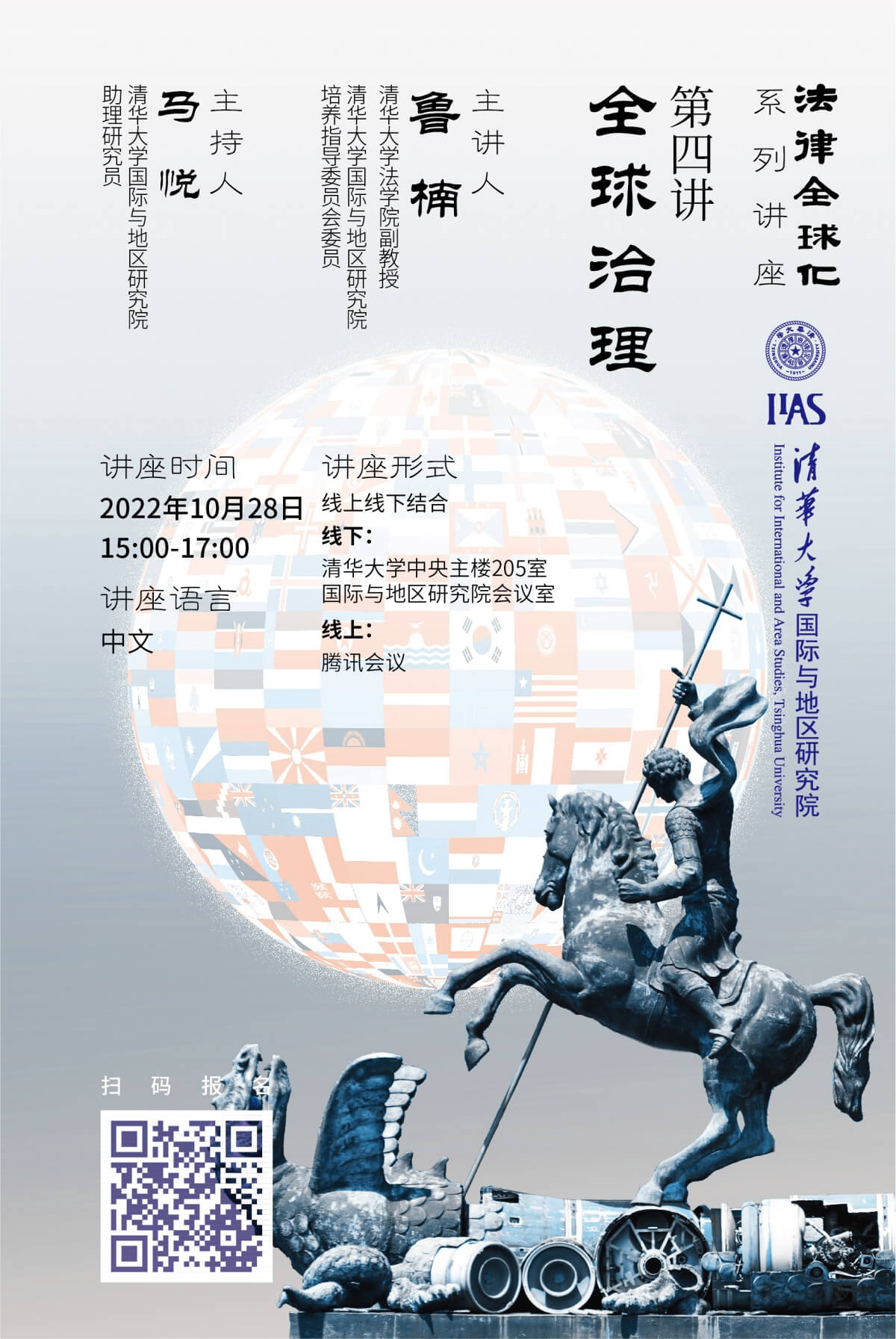• On the afternoon of October 28, 2022, the Institute for International and Area Studies (IIAS) for Tsinghua University hosted the fourth lecture of the “Globalization of Law” Series for the fall semester at Room 205, Central Main Building. Themed “Global Governance,” the lecture was delivered by Lu Nan, Associate Professor of the School of Law, Tsinghua University and a member of the IIAS Teaching Committee, and was presided over by Ma Yue, Assistant Professor of IIAS. IIAS faculty members and doctoral students, scholars and students from outside the Institute at home and abroad, and others interested in the topic attended the lecture online or offline.