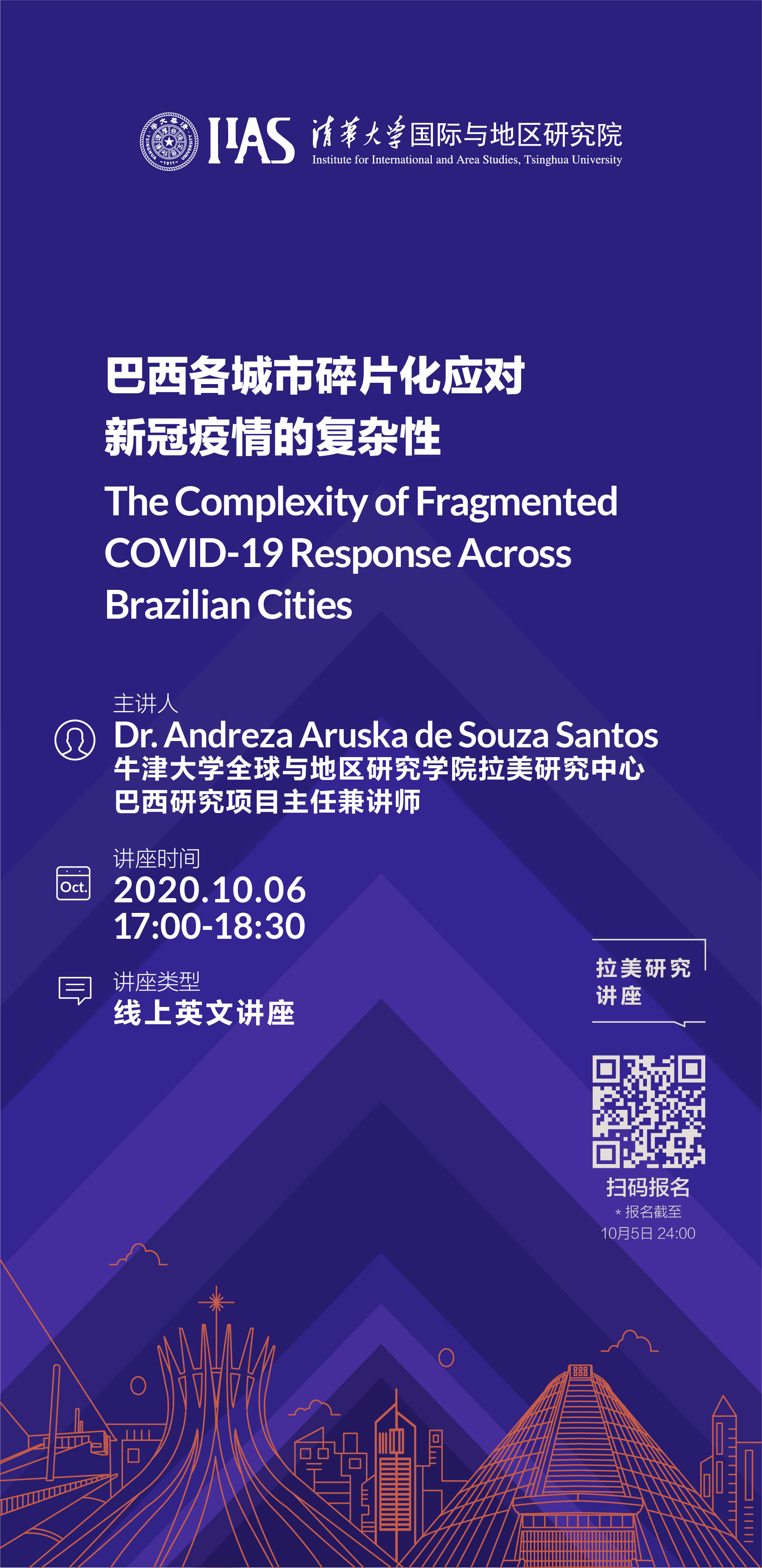 On the evening of October 6th, 2020, Dr. Andreza Aruska De Souza Santos, Director of the Brazilian Research Program at the University of Oxford, gave an online lecture entitled “The Complexity of Fragmented COVID-19 Response Across Brazilian Cities” to doctorate candidates at Institute of International and Aare Studies, Tsinghua University (IIAS-THU) and other scholars interested in Latin American studies.