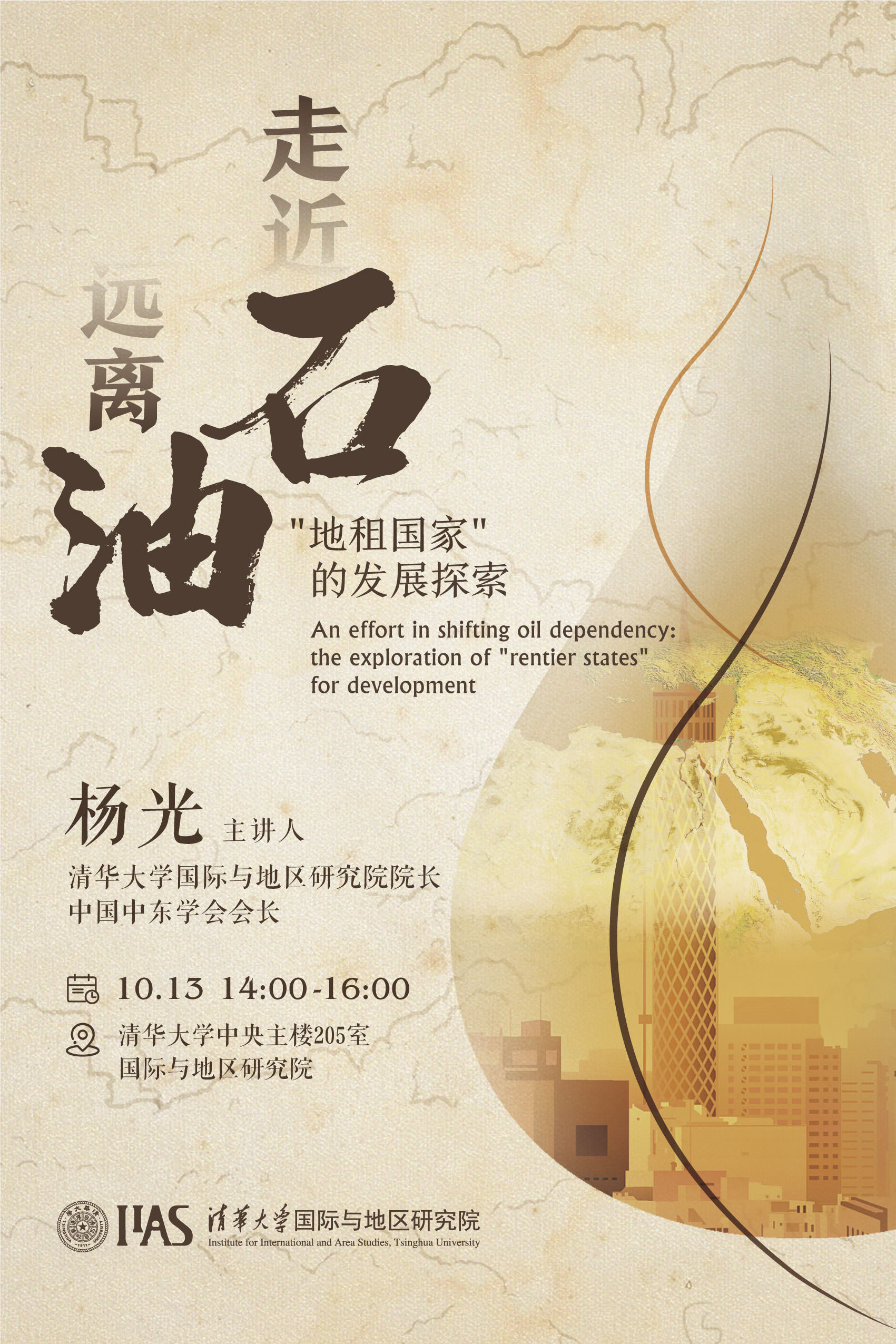 On the afternoon of October 13th, 2020, Prof. Yang Guang, Director of Institute of International and Area Studies, Tsinghua University (IIAS-THU) and President of China Middle East Society, delivered a themed lecture entitled “An Effort in Shifting Oil Dependency: the Exploration of ‘Rentier States’ for Development” in Auditorium 205 of the Central Main Building of Tsinghua University, which provided IIAS faculty and students with an in-depth interpretation of the history and economic model of Rentier States in the Middle East. Through this event, Prof. Yang demonstrated a paradigm for interdisciplinary area studies to the audience by combining macro theory with micro data and political science with economics. This lecture is also the first in a series of lectures on “The Diversity of the Middle East” at IIAS. Wang Tingyi, Research Assistant Professor at IIAS, presided over the event.