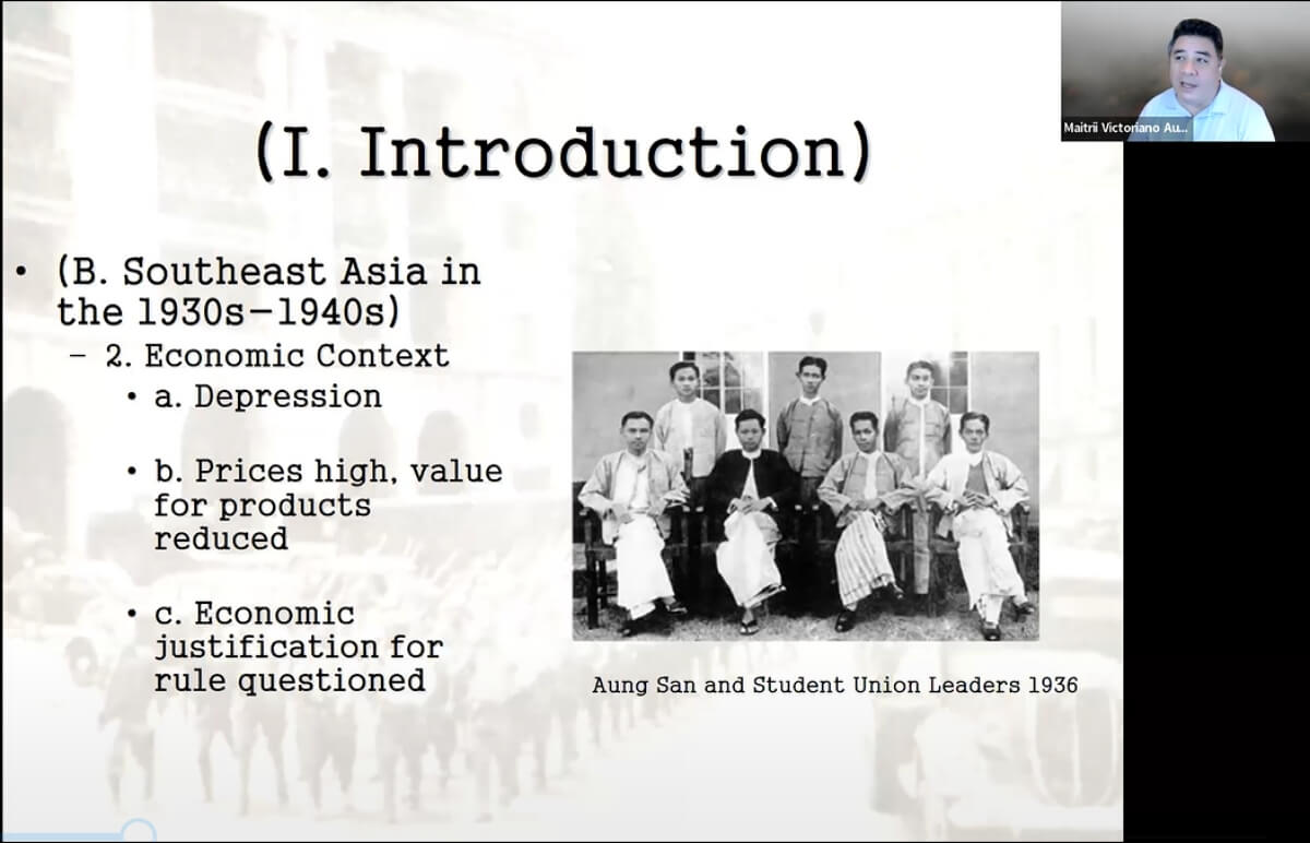 讲座的第一部分,昂敦教授介绍了第二次世界大战前夕及战争期间东南亚社会所发生的变化。20世纪30至40年代,欧洲殖民帝国间的竞争达到了顶峰,与此同时,东南亚的反殖民运动逐渐酝酿成形,但都遭到了政治上的压制。经济大萧条对东南亚造成了相当的冲击,人们将此归咎于殖民地与宗主国之间的经济联系,从而进一步质疑殖民经济体系的合法性。文化上,民族主义和共产主义的新思想通过受教育的精英在东南亚当地传播,成为重新凝聚社群的意识形态。二战前夕,人们已经意识到,东南亚社会无法再回到前殖民时代了。