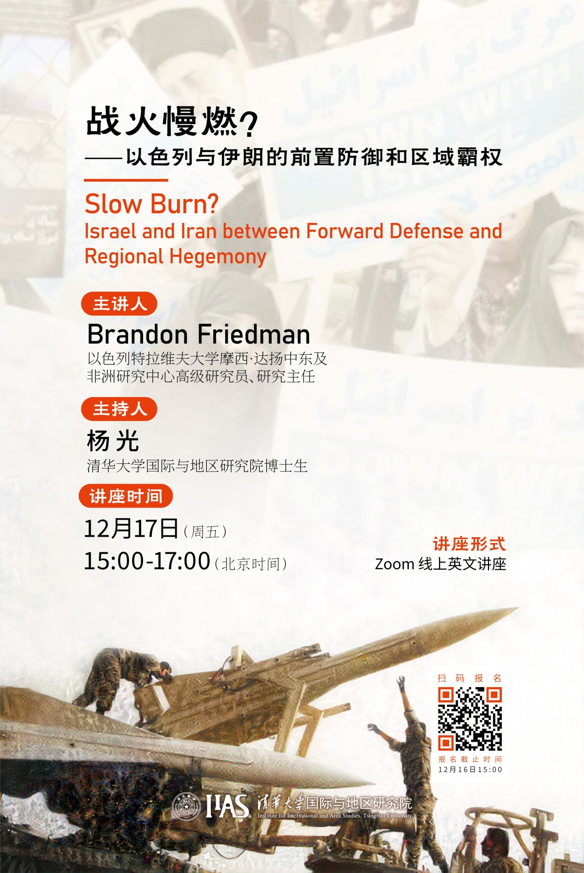 中东系列讲座第五讲于线上举行。本次讲座主题为“战火慢燃?——以色列与伊朗的前置防御和区域霸权”,主讲人是以色列特拉维夫大学摩西·达扬中东及非洲研究中心高级研究员、研究主任Brandon Friedman博士,地区研究院博士生杨光主持了讲座。