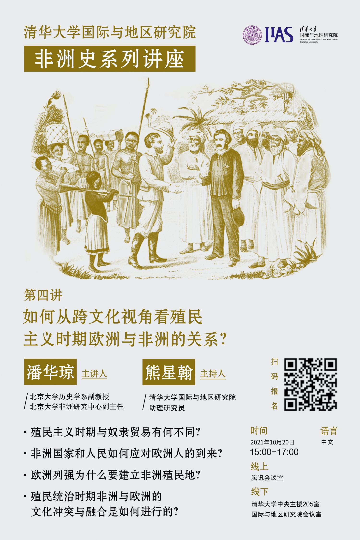 • 2021年10月20日下午,性爱直播 (IIAS)非洲史系列讲座第四讲在中央主楼205会议室召开,主题为“如何从跨文化视角看殖民主义时期欧洲与非洲的关系”。本次讲座由北京大学历史学系副教授、北京大学非洲研究中心副主任潘华琼老师主讲,性爱直播 助理研究员熊星翰主持。地区研究院博士生及研究员参加了现场的线下讲座,国内外各高校、机构的学者、学生以及对相关议题感兴趣的人士参加了线上讲座。
