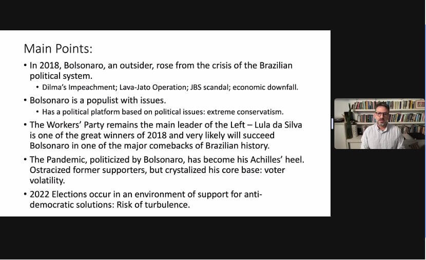 讲座伊始,Rennó老师简要地介绍了本场讲座的要点。2018年,博索纳罗(Jair Bolsonaro)曾作为局外人,在当年的巴西政治体系危机中崛起成为新一任总统;当年巴西的腐败丑闻极大地影响了执政党候选人卢拉(Luiz Inácio Lula da Silva)的竞选,并直接导致其被监禁。而今,在新冠疫情的冲击下,博索纳罗对疫情的政治化使其失去部分核心支持者;巴西劳工党总统候选人卢拉则极可能接替博索纳罗,复出成为下一任总统。首先,Rennó老师通过图表清晰地展示博索纳罗的核心支持者与反对者占比从2018年至今的浮动变化,并深入剖析支持博索纳罗群体的特征,例如支持私有化的自由经济,抗拒旨在实现平权的社会政策等。同时,Rennó老师解析了与博索纳罗主义相关的关键词语,如反对劳工党、反对强制性的疫苗接种、反对堕胎等诸多保守主义的右翼立场。接着,Rennó老师细致地解析在2018年到2022年期间博索纳罗和卢拉的选民基础的变动,尤其是双方的稳定选民基础和波动选民群体。最后,Rennó老师就2022年巴西总统大选的前景进行了前瞻,认为尽管卢拉在第一轮大选中的优势可能更大,但双方大概率还是会进行第二轮的较量;与此同时,除卢拉和博索纳罗两位热门候选人以外的“第三种可能性”微小。巴西人民的最终抉择或将巴西带上不同的未来道路;一旦获得连任,博索纳罗在第二个任期中可能会进一步升级经济自由化的改革,而教育、环境、科学、人权等领域的发展阻碍也会加大;如果其连任失败,巴西的民主危机或有机会得到缓解。