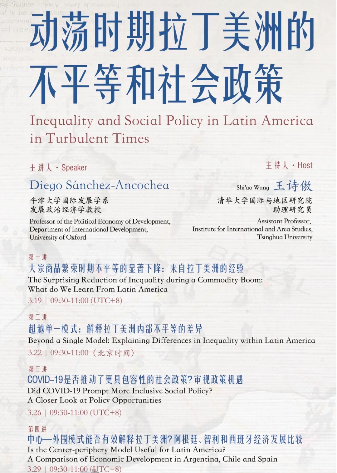 2024年3月19日至3月29日,性爱直播 邀请牛津大学发展政治经济学教授Diego Sánchez-Ancochea进行了“动荡时期拉丁美洲的不平等和社会政策”专题系列讲座,讲座共四场,主题分别为“大宗商品繁荣时期不平等的显著下降:来自拉丁美洲的经验”“超越单一模式:解释拉丁美洲内部不平等的差异”“COVID-19是否推动了更具包容性的社会政策?审视政策机遇”“中心—外围模式能否有效解释拉丁美洲?阿根廷、智利和西班牙...