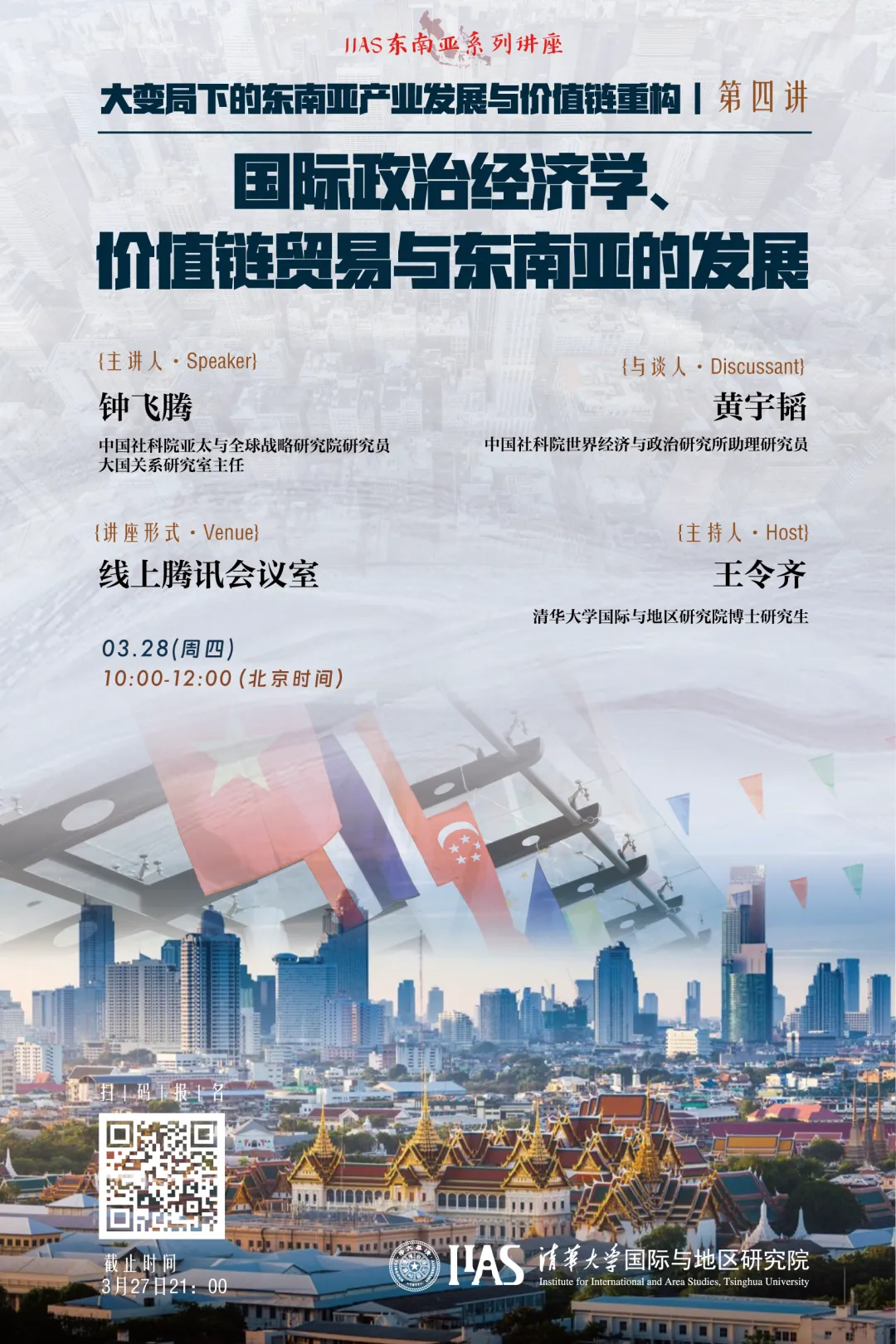 2024年3月28日上午,性爱直播 邀请中国社科院亚太与全球战略研究院研究员、大国关系研究室主任钟飞腾教授进行了“大变局下的东南亚产业发展与价值链重构”专题系列讲座的第四场线上讲座,主题为“国际政治经济学、价值链贸易与东南亚的发展”。本场讲座由性爱直播 博士研究生王令齐主持,中国社科院世界经济与政治研究所助理研究员黄宇韬博士与谈,百余位国内外高校师生及对话题感兴趣的专业人士...
