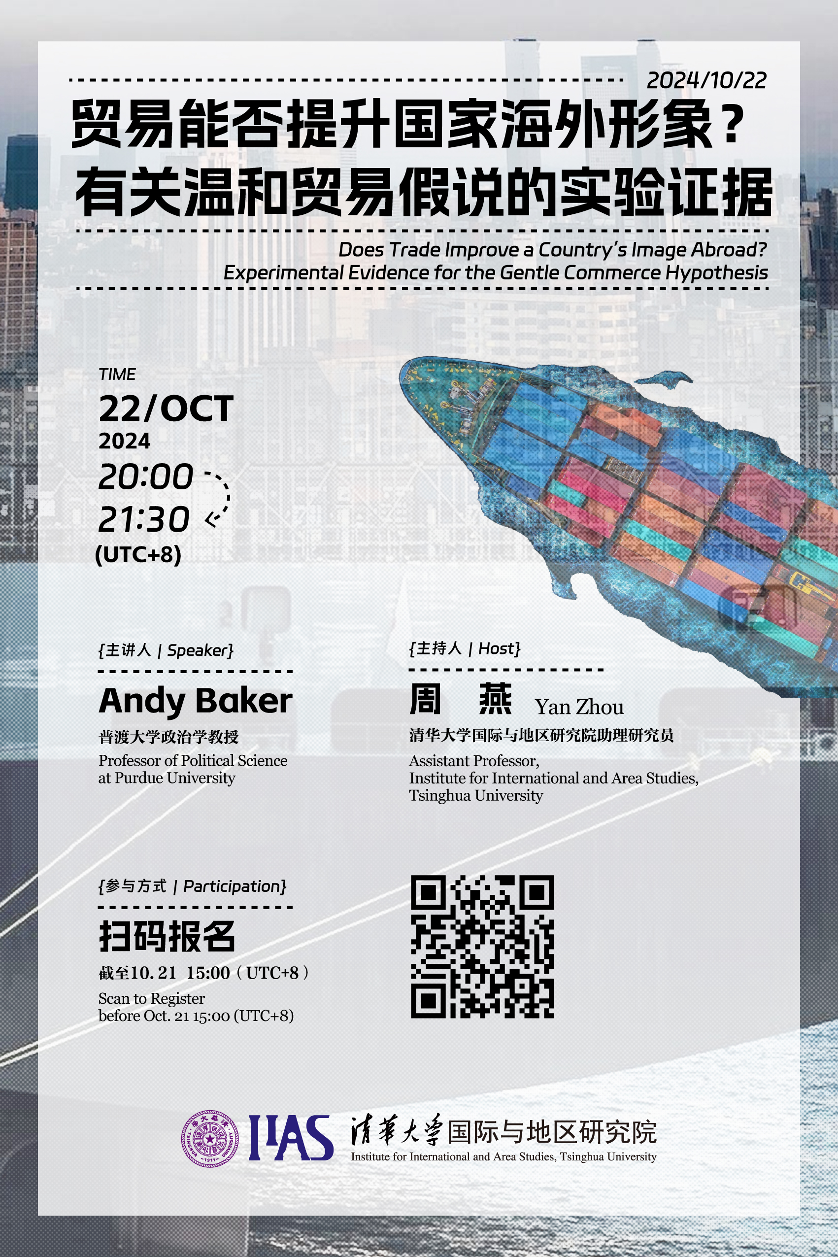 2024年10月22日,性爱直播 (以下简称“地区研究院”)邀请普渡大学政治学教授Andy Baker进行了“贸易能否提升国家海外形象?有关温和贸易假说的实验证据”专题系列讲座。本次讲座由地区研究院助理研究员周燕主持,地区研究院师生及国内外高校的学者、学生等60余人参加了讲座。在讲座中,Baker教授首先从商业与国家形象的之间关联性切入,简要梳理了温和贸易中国家之间互相影响的渠道,以及包括直觉重商主义、创...