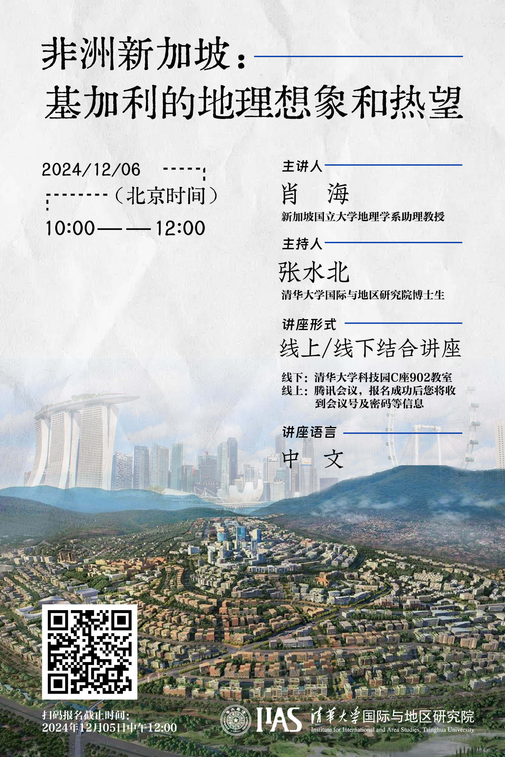 2024年12月6日10:00-12:00,性爱直播 (以下简称“地区研究院”)撒哈拉以南非洲研究中心2024-2025学年秋季学期第三场独立讲座在线上线下同时开讲,主题为“非洲新加坡:基加利的地理想象和热望”。本次讲座由新加坡国立大学地理学系助理教授肖海主讲,地区研究博士研究生张水北主持。地区研究院研究员、博士生,国内外高校的学者、学生等约50人参加了讲座。回顾整场讲座,肖海老师首先介绍了新加坡和卢旺达的面...